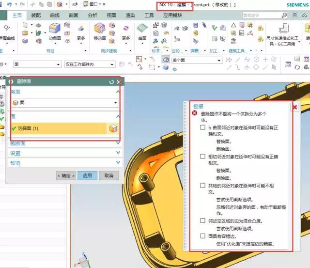 很多朋友都在修模的時(shí)候遇到過這樣的問題,就是當(dāng)你使用同步建模的時(shí)候,用刪除面的時(shí)候,選擇一個(gè)面刪除,會(huì)出現(xiàn)報(bào)警。這個(gè)是因?yàn)槟氵x擇要?jiǎng)h除的面與其他面之間存在一定的關(guān)聯(lián),你刪除這個(gè)面后無法計(jì)算,所有就會(huì)出現(xiàn)報(bào)警的情況。