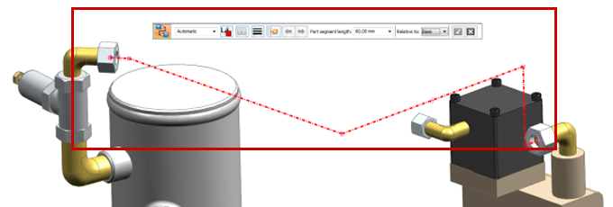 快速布管命令在 3D 草圖環(huán)境中可用,因此可自動在兩個點之間創(chuàng)建 3D 草圖路徑。此命令在 3D 草圖中稱為管線路徑,且此命令條包含的選項比標(biāo)準(zhǔn)快速布管命令條要多。在 3D 草圖中使用此命令時,可使用其他選項來應(yīng)用顏色和線條樣式,以及創(chuàng)建相對于用戶定義坐標(biāo)系的路徑。