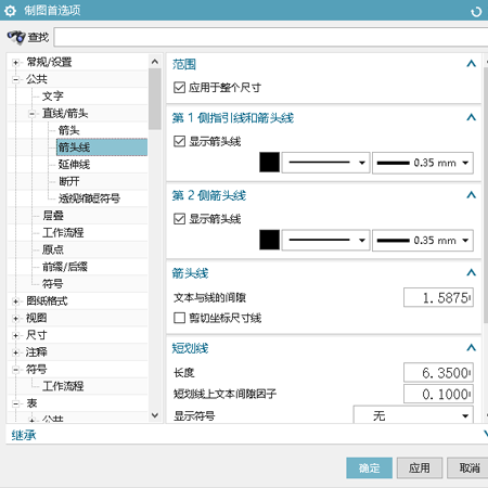 1、點擊:菜單→首選項→制圖,然后選擇:公共→直線/箭頭→箭頭線。