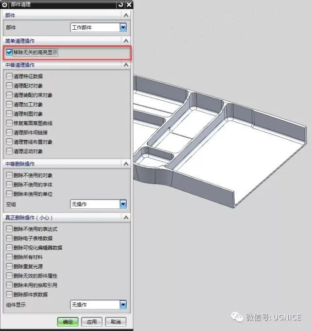 二、進(jìn)入【部件清理】對(duì)話框,在“簡(jiǎn)單清理操作”欄勾選“移除無(wú)關(guān)的高亮顯示”,然后【確定】或【應(yīng)用】,這樣就可以輕松的移除的無(wú)關(guān)的高亮顯示。